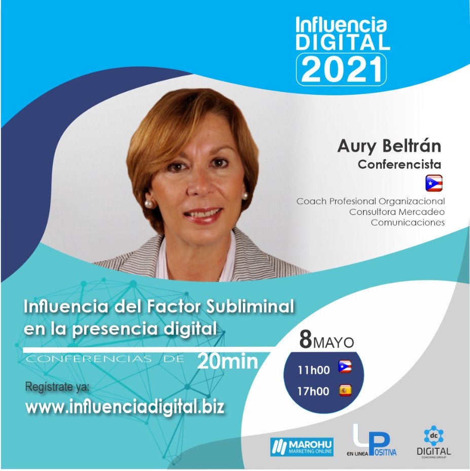 En Línea Positiva, Marohu Marketing y Digital Coaching Group les invitan al gran evento INFLUENCIA DIGITAL, el próximo 08 de mayo con la Dra. Aury Beltrán, Coach profesional, digital y ontológico con su tema Influencia del Factor Subliminal (FS) en la presencia digital.