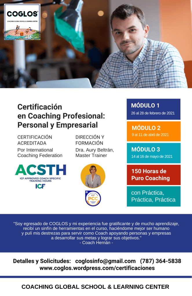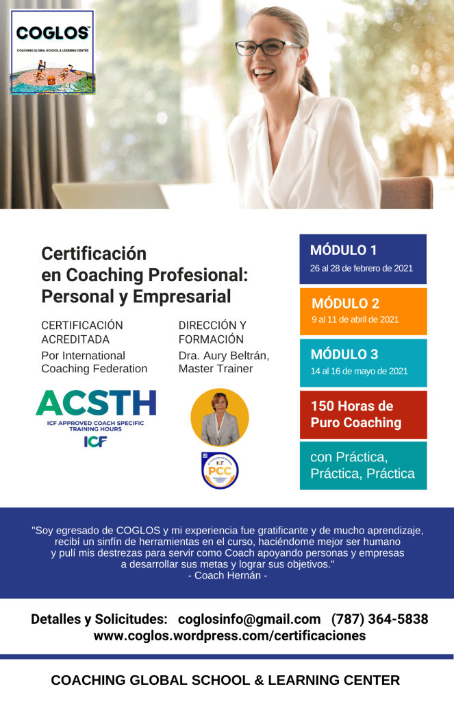 En Coaching Global School & Learning Center (COGLOS), proveemos variedad de servicios de Coaching Profesional para sus líderes, desde Coaching Ejecutivo a Certificaciones a programas corporativos. Para orientación, puede llamarnos al (787) 364-5838.