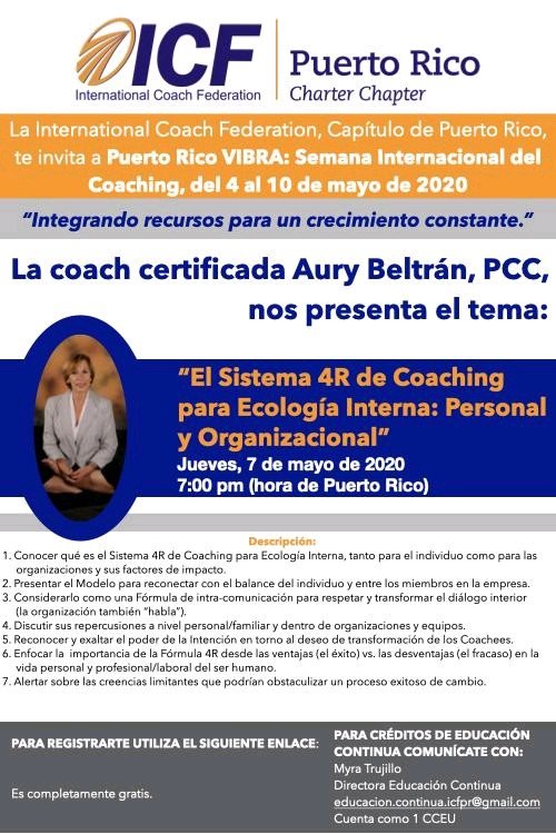 Nuestra directora, la Dra. Aury Beltrán, PCC-ICF, impartirá una conferencia magistral como parte de los diez webinars a presentarse esa semana.
